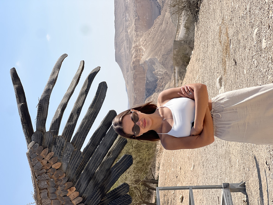 The scene is set outdoors at the Griffon Viewpoint, overlooking Nahal Tzin canyon in the Ramat Negev Regional Council, Israel. A female subject stands centrally in the foreground, facing the camera. She appears to be in her mid-20s to early 30s, with brown hair and dark, oval-shaped sunglasses. She is wearing a white halter-neck crop top, a light beige or off-white drawstring midi skirt, and a silver necklace with a small pendant. Her arms are crossed in front of her chest, and she exhibits a slight smile. Behind her, to the left and extending upwards, is a large wooden sculpture resembling a bird's wing. It is constructed from numerous dark, irregularly shaped wooden planks arranged to simulate feathers. To the far left, a grey metal structure, possibly a stand or railing, is partially visible. The background features a vast, arid desert landscape under a clear blue sky. A deep canyon, identified as Nahal Tzin, dominates the view, with distinct layers of sedimentary rock forming its walls. A winding road or path is visible at the base of the canyon. The immediate ground surface is composed of light-colored gravel and sparse, dry vegetation. The scene is brightly illuminated by direct sunlight, indicating a clear, sunny day.