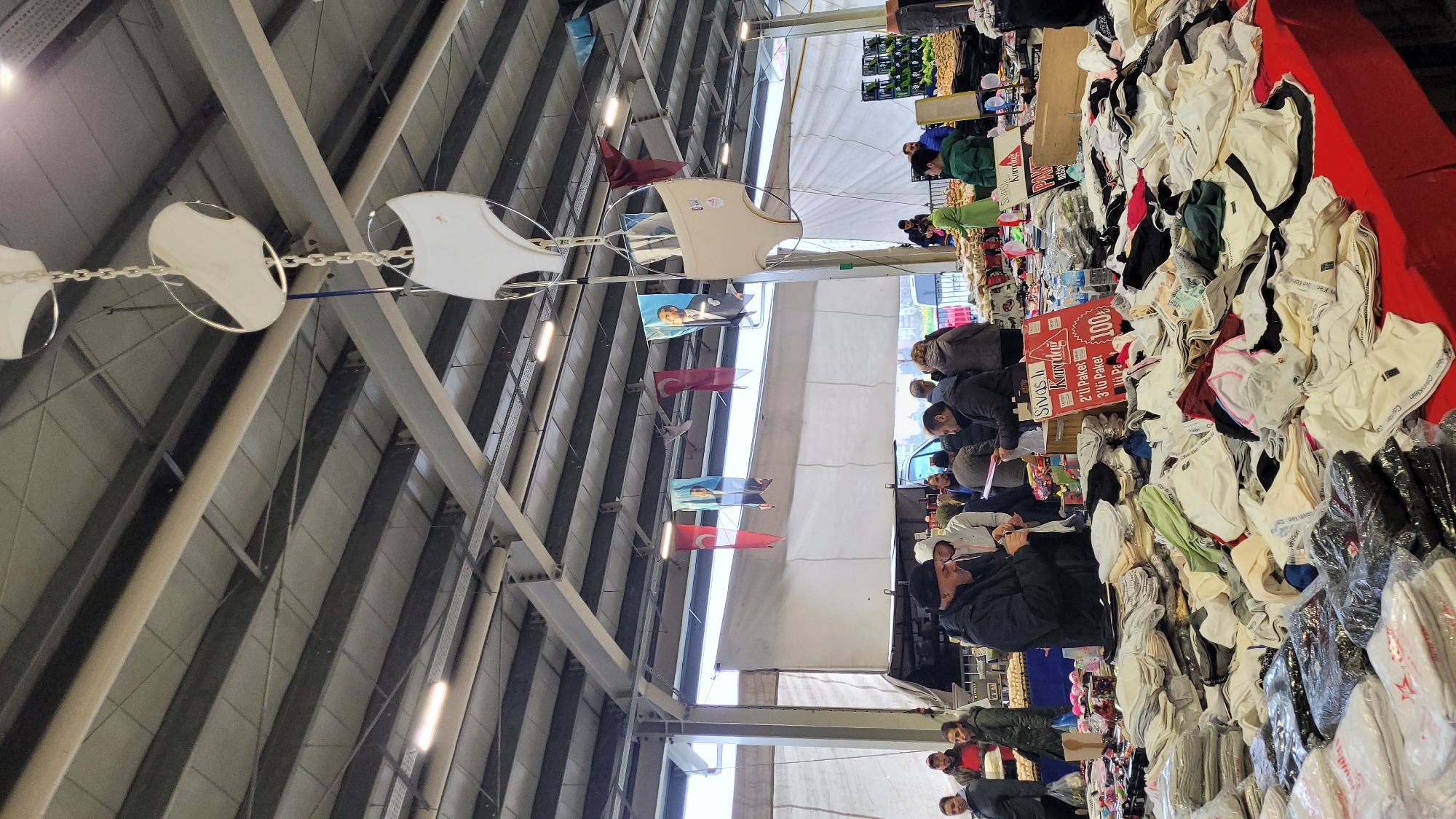 Here's a detailed description of the image: **Location and Environment:** The image appears to be taken inside a large indoor market or event space. The structure has a high, metal-beamed ceiling with artificial lighting. Decorations, including white, sail-like ornaments and Turkish flags, hang from the ceiling. **Subjects and Objects:** * Market stalls are set up with a variety of goods for sale, notably clothing. Some tables are covered with a jumble of garments, predominantly white or light-colored, with labels visible on some items. * A sign prominently displays "Sivas İl Koop" and advertises offers such as "2'li Paket" (2-pack) and "3'lü Paket" (3-pack) for 100 TL. * There are multiple individuals browsing and interacting with the vendors. Some are examining the clothing, while others appear to be making purchases. **Actions and Interactions:** People are actively engaged in shopping and browsing the items on display. Vendors are present, presumably assisting customers. **Overall Impression:** The image captures a lively scene at a market in Turkey, potentially in the Beylikdüzü area. The focus is on the bustling atmosphere and the range of goods available for purchase.