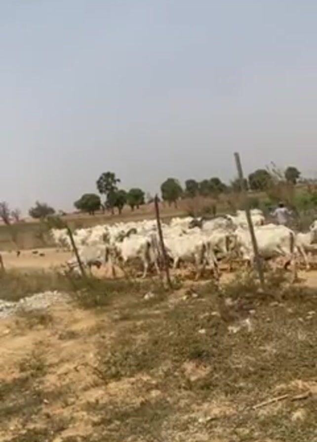 herd of white cattle moving across a dry, dusty field under a clear, bright sky. The landscape features sparse vegetation with scattered trees in the background. Several thin posts are placed intermittently along the edge of the field, serving as a makeshift boundary. A man can be seen among the cattle, presumably herding them. The cattle are moving at a steady pace, kicking up dust as they go.
