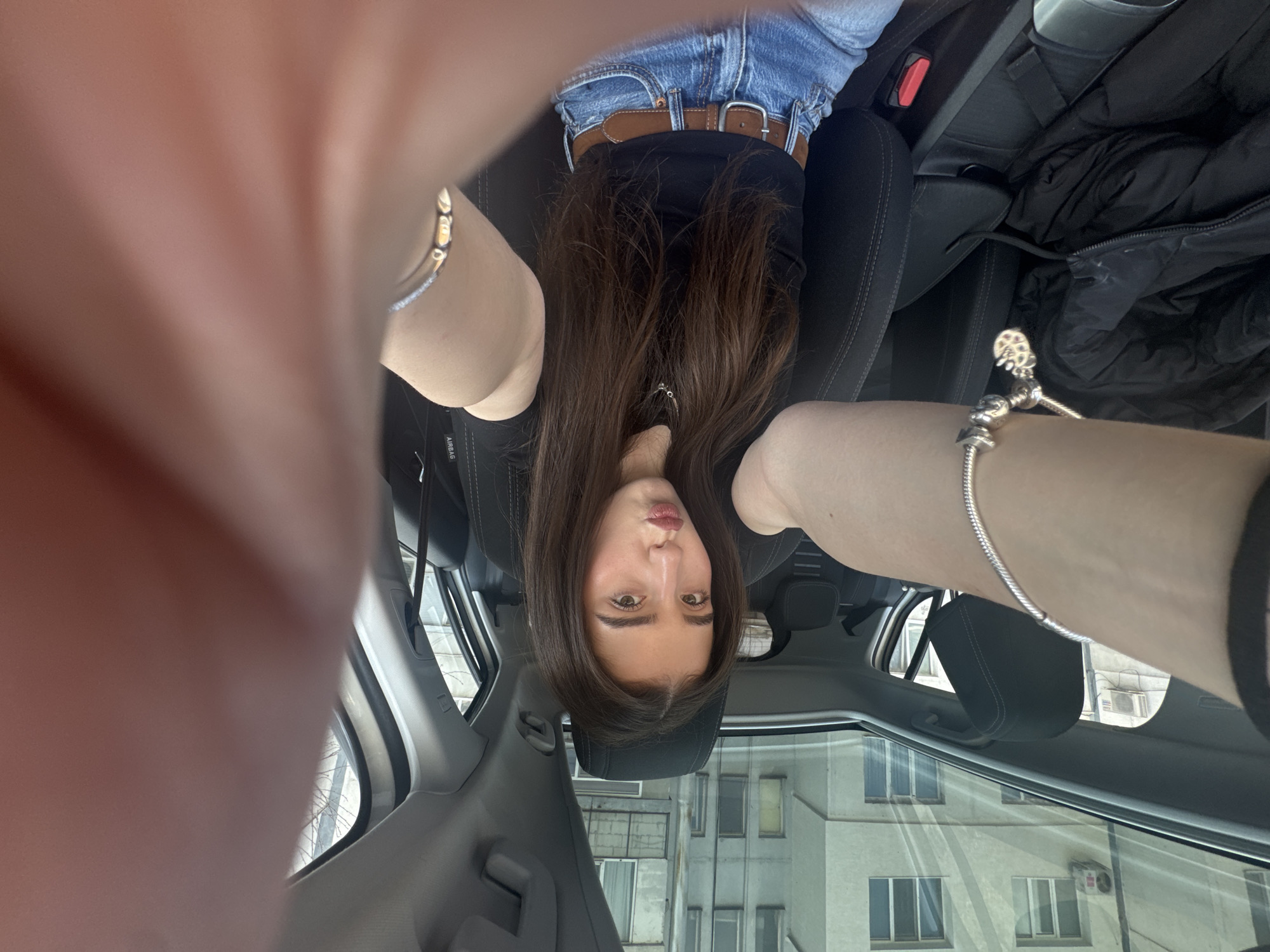 A tilted image captured from inside a vehicle depicts a young female subject seated in the front passenger seat. She has long, dark brown hair, wears a black top, blue denim jeans, and a brown leather belt. A silver chain necklace and a silver charm bracelet are visible. Her right arm is extended towards the camera, with her hand holding the device from an obscured angle. Her lips are slightly puckered, and she looks directly at the camera. The car interior features black seating upholstery, a gray roof lining, and an open sunroof. A black jacket is discarded on the rear passenger seat, and an "AIRBAG" label is visible on the passenger-side pillar. Outside the vehicle, a multi-story, light-colored building with rectangular windows and an external air conditioning unit is visible, indicating an urban setting within the city of Unknown, Unknown.