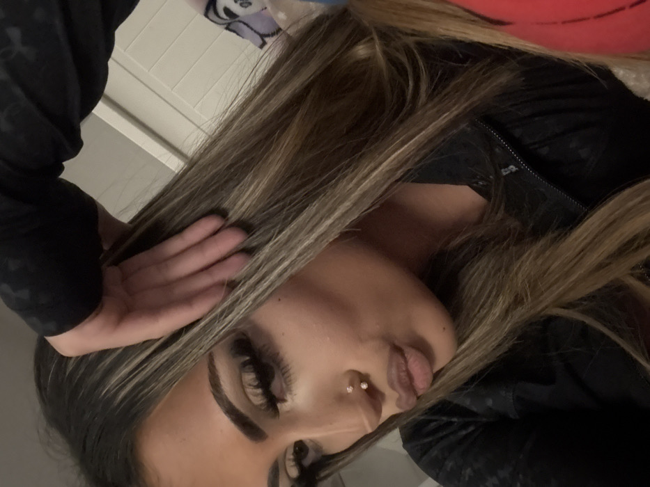 A woman poses with her hand near her head, showcasing long, highlighted brown hair. She has full eyebrows, dark eye makeup, and a nose piercing. Her lips are slightly puckered. She is wearing a black top with an Under Armour logo. The background includes a white door and part of a patterned blanket. The image is rotated, giving a tilted perspective.