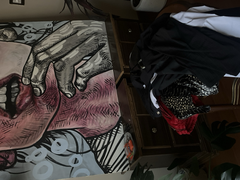 The image depicts an interior residential scene, understood to be within Mexico City, Mexico. In the background, a large, rectangular pop-art style painting is prominently displayed, resting on a dark brown wooden dresser with brass drawer pulls. The painting portrays the lower portion of a woman's face and hands in a graphic, comic-book aesthetic; her red lips are slightly parted exposing upper teeth, and her grey-toned hands with black outlines are positioned near her chin and mouth, which feature red and black cross-hatching for texture. The painting's background is light blue with white and dark grey circular and wavy elements. On the left side of the dresser, a small white plate holds several orange and white candies or small objects. In the immediate foreground, a stack of various garments is piled on a circular wooden table. The clothing includes black fabrics, white fabric, a red textured garment (possibly shorts) with an elasticized band, and a black and off-white patterned fabric, possibly leopard print. Green foliage from a houseplant is visible on the left side, partially obscuring the lower left corner. Another plant in a white cylindrical planter is visible on the right, behind the pile of clothes. The floor is dark wood. The room appears dimly lit.