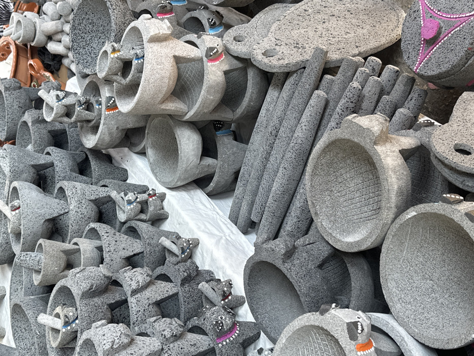 This image depicts a densely packed display of traditional Mexican kitchen implements, primarily made from dark grey, speckled volcanic stone, likely at a market stall in Tepalcingo, Mexico
