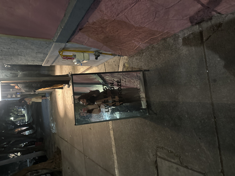 A sidewalk advertisement leans against a building. The sign displays an image of two young women taking a selfie with the tagline "Live Fast, Have Fun, At FROZE." The sign's reflection shows a restaurant interior and people, including a man in a brown coat. The sidewalk is partially visible, and the building's facade shows textured concrete and painted surfaces. A gas meter and pipes are visible on the building's exterior. The scene is bathed in artificial light, giving it a nighttime appearance.