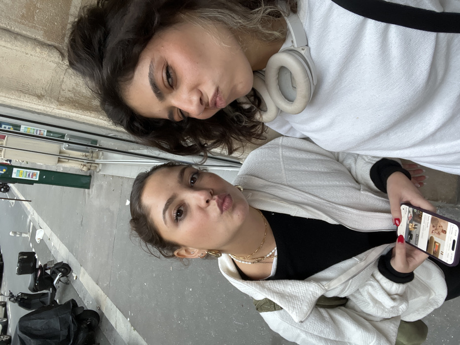 Two young adult females pose for a photograph on a street in Paris, France