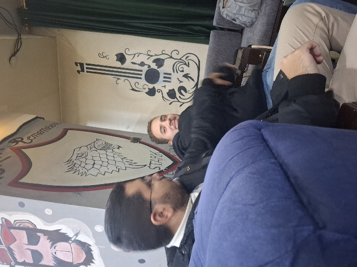 Three people are seated indoors. One person is wearing tan pants and a dark jacket, with their hand visible. Another person is wearing a black jacket. The third individual is primarily obscured by a large blue object, wearing a black jacket with a white shirt collar. A wall features a painting of a wolf emblem labeled "STARK" with the word "Remember" above. A guitar design is also painted on the wall. A dark green curtain or fabric is seen at the top of the image.