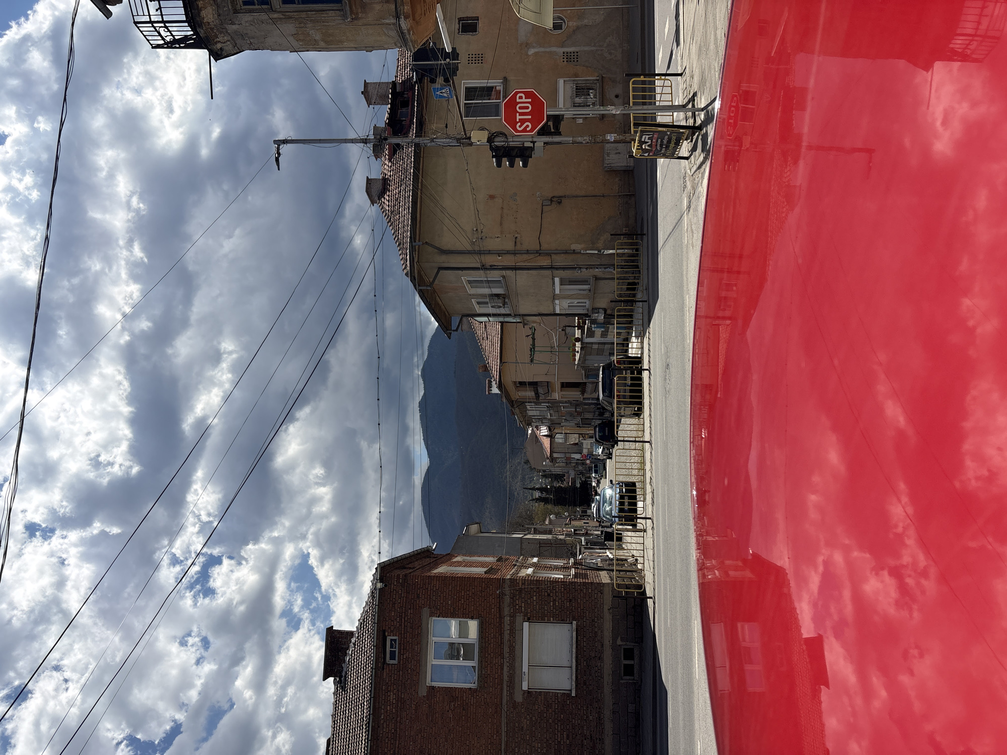 street scene in the city of Peshtera, Bulgaria, with buildings lining the street on either side. In the background is a mountain partially obscured by clouds. There is a stop sign and a traffic light visible. Utility wires are strung across the sky. In the foreground is a red, reflective surface, possibly a vehicle. There are no visible people. Several parked cars are visible along the street.