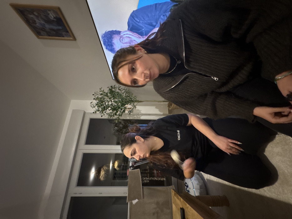 Two women are in a living room. One woman is wearing a black sweater and looking directly at the camera. The other woman is wearing a black t-shirt and brushing her hair. A television is in the background with a man on the screen. A picture is on the wall. There is a plant and a window in the background.
