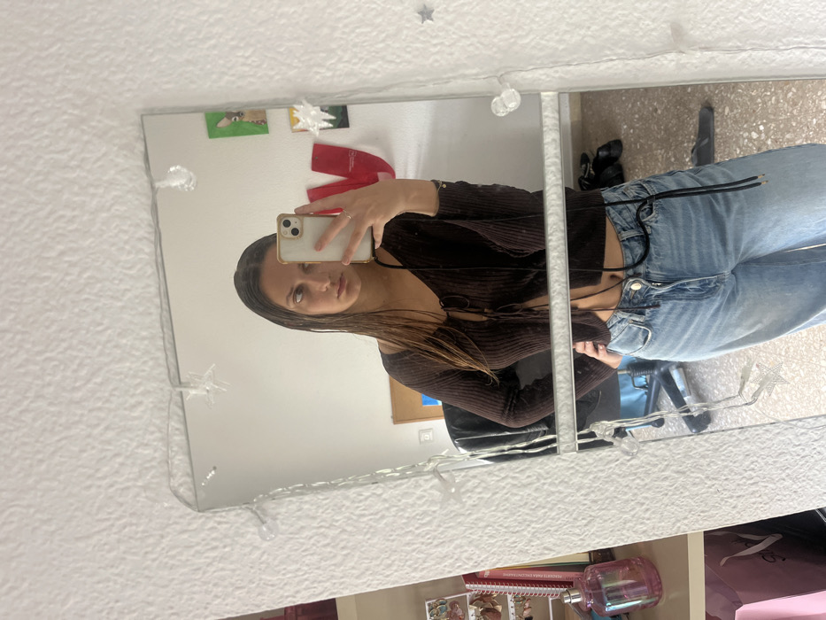 An indoor mirror selfie captures a young woman standing in a room located in Valencia, Spain. She is holding a light-colored smartphone in her left hand (reflected right) to take the image, with her right hand (reflected left) on her hip. Her dark, wet hair is parted in the middle and hangs straight down. She is dressed in a dark brown, ribbed, long-sleeved cropped top with a tie-front, and light blue, high-waisted jeans, from which a black cord with gold tips hangs. A ring is visible on her left ring finger. The rectangular mirror is mounted on a textured white wall and adorned with a string of clear star and round-shaped decorative lights along its top and left edges. The reflection reveals parts of the room: a dark office chair, a brown wooden surface, and a light-colored floor with dark shoes. On the reflected right, a bookshelf holds books with red spines and a pink perfume bottle. On the reflected left, the white wall features a green picture depicting a deer, a red letter "U" decoration, and various star and snowflake embellishments.