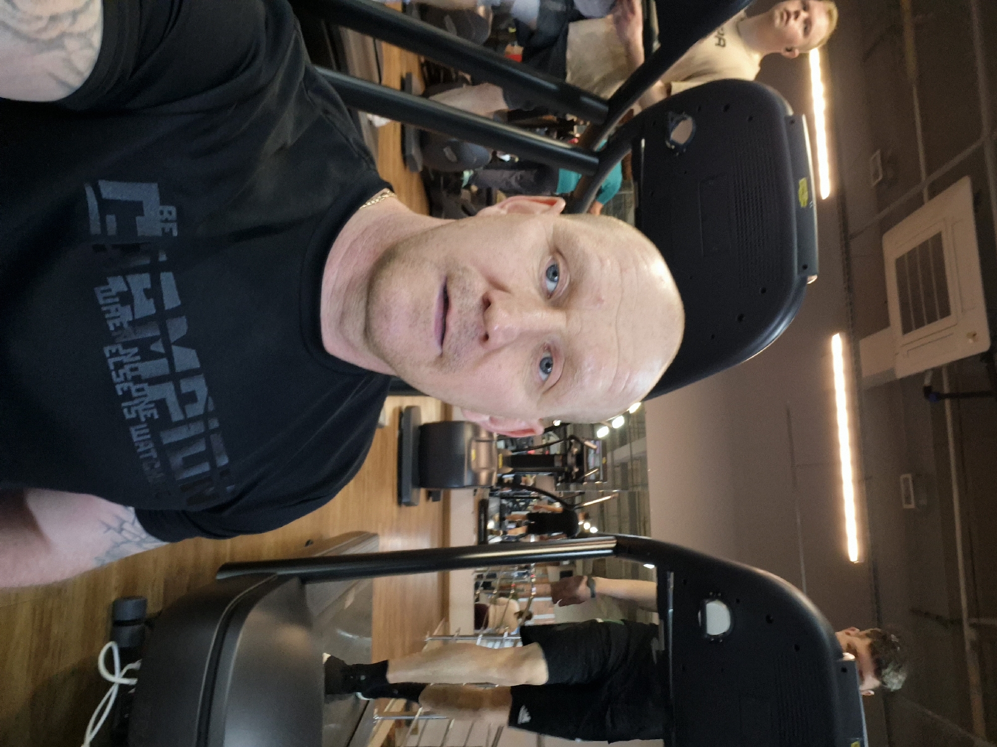 The image depicts a bald man with blue eyes and a black t-shirt, likely in a gym setting