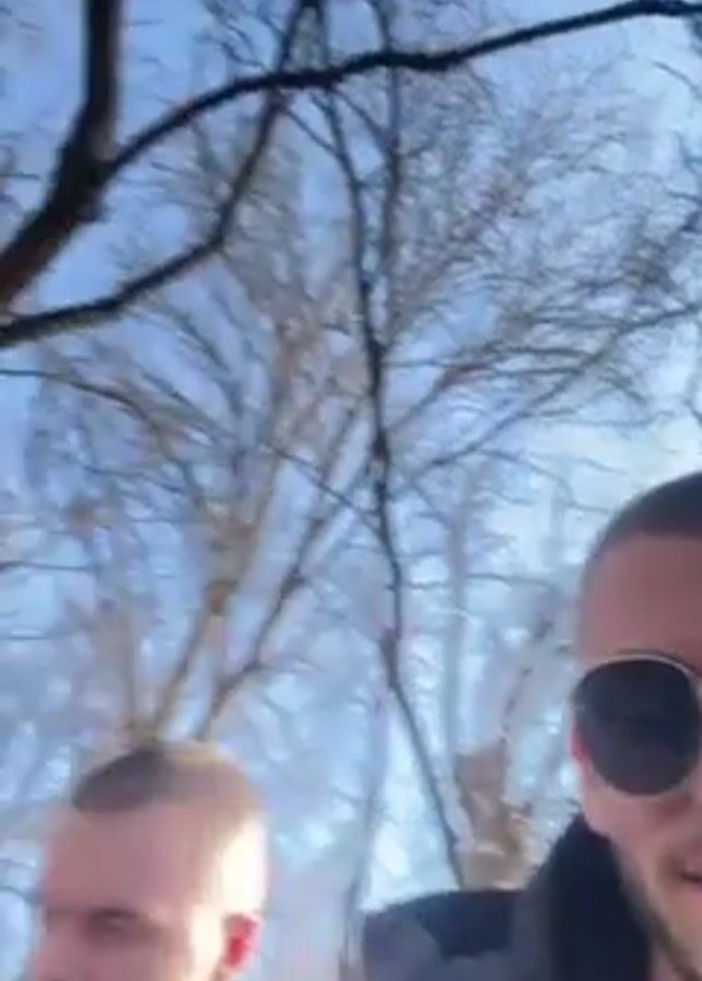 Two young men are outside on a sunny day, under the bare branches of trees. The first man, with a buzz cut and wearing round sunglasses, is speaking directly to the camera, pointing to his head. He is wearing a black hooded sweatshirt and a black jacket. The second man, also with a buzz cut, sits next to him, looking down and seemingly at his phone. He wears a black hooded sweatshirt with a red symbol on it. The sky is blue.