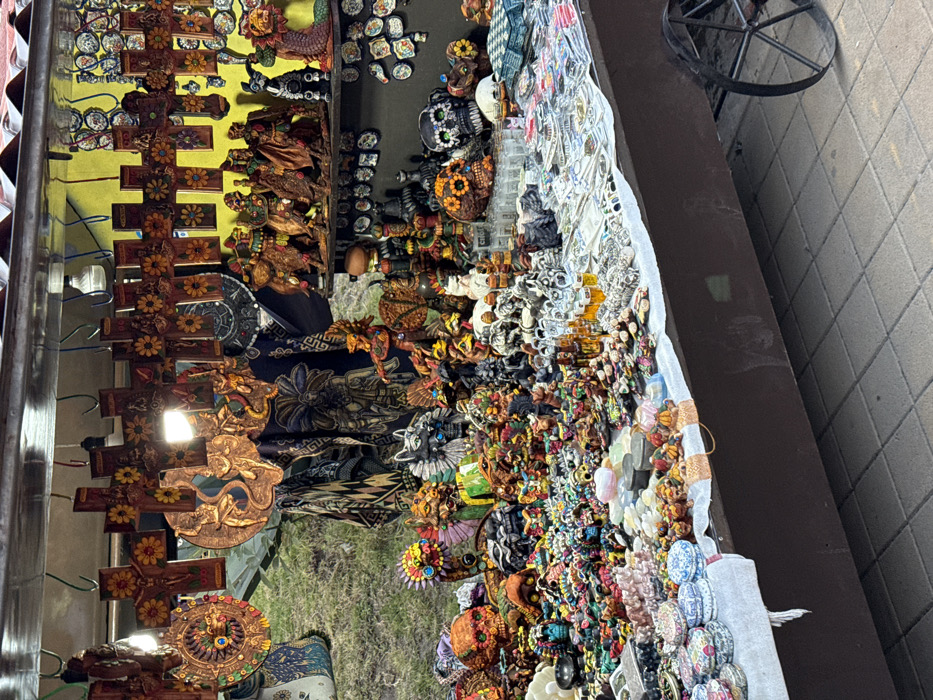 A vibrant outdoor market stall overflows with an array of colorful Mexican crafts. Hand-painted ceramics, intricate wooden carvings, and sugar skull-themed items are displayed. Textiles with ornate patterns are also visible. The stall is located beside a sidewalk. A large wheel is partially visible at the upper right corner.