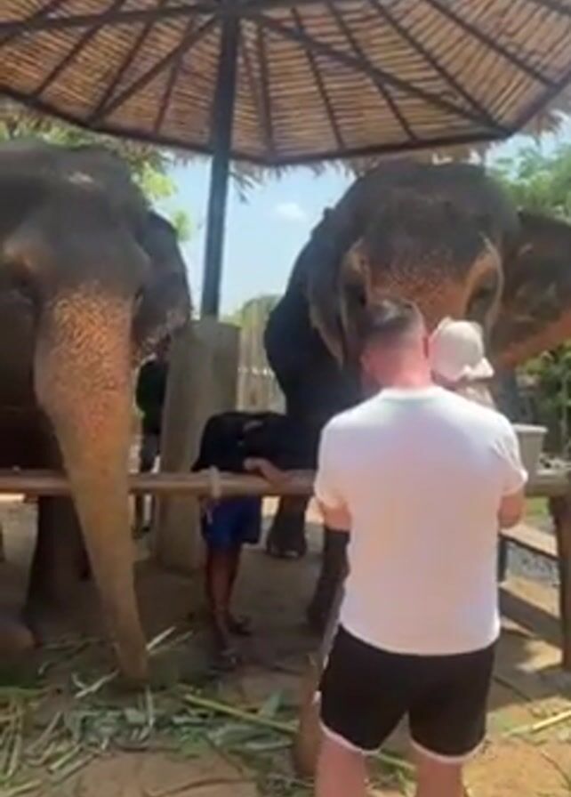 A man holds a small child in his arms, standing in front of a low fence by two elephants. The man reaches out to touch one of the elephants on the face. The elephants are under a thatched-roof umbrella structure, and there are green branches scattered on the ground. Behind the man, a child in blue shorts leans on the fence.