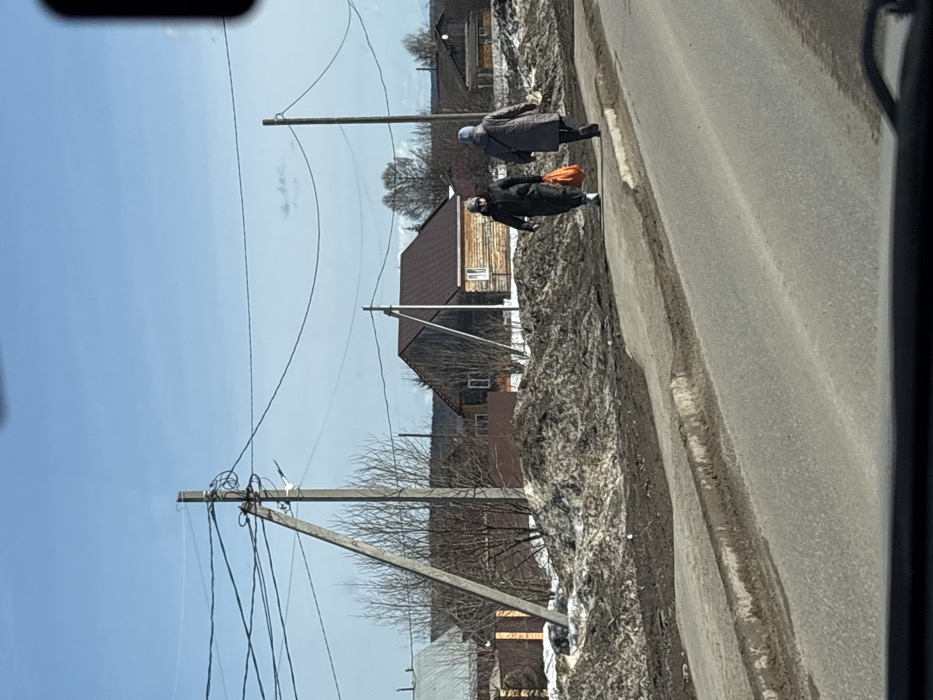 This image depicts an outdoor street scene in Кукуштан, Russia, under a clear blue sky with minimal cloud cover. The perspective is from inside a vehicle, with the lower edge of the windshield visible at the bottom. An asphalt road, partially covered with dirt and debris, is in the foreground, bordered by a dirty concrete curb. On the right side of the road, a concrete sidewalk is present. Two adult women are walking on this sidewalk, moving away from the viewer towards the right. The woman closer to the camera wears a dark coat, dark pants, light-colored shoes, sunglasses, and a dark head covering, carrying an orange plastic bag in her right hand. The woman behind her is dressed in a light grey coat, dark pants, dark shoes, and a light-colored head covering. To the left of the sidewalk, between it and the background structures, are irregular mounds of dirty, melting snow mixed with mud and debris. Bare trees and shrubs with no foliage are scattered behind these piles. Several utility poles with a complex network of overhead power lines crisscross the mid-ground. A prominent concrete utility pole with a diagonal support strut stands on the left, featuring a small white bird or a bird-like object perched on an insulator. Further right, a thinner wooden utility pole is visible. In the background, a series of single-story houses is visible, predominantly constructed of wood with varying dark-colored roofs. A distinct light-colored log house with a brown roof and a white-framed window is situated in the mid-right background. A faint treeline marks the distant horizon.