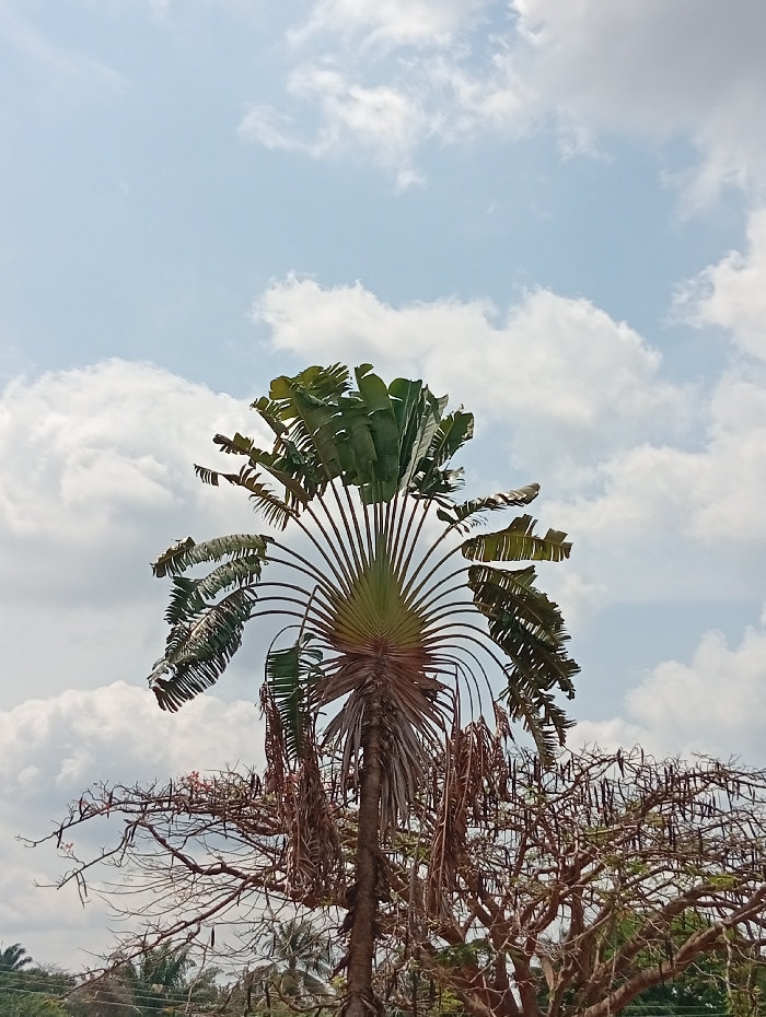 The image displays an outdoor scene in Nsukka, Nigeria, under a bright, partially cloudy sky. The central subject is a tall Traveler's Palm (Ravenala madagascariensis), presenting a large, fan-shaped crown of vibrant green leaves at its apex. Below the living foliage, numerous dried, brown palm fronds hang down around the trunk. To the lower right of the Traveler's Palm, a large deciduous tree with a dense network of bare, brown branches is visible, from which numerous elongated, dark seed pods are suspended. Distant green foliage and other trees form a blurred background. The upper portion of the frame is dominated by a light blue sky with scattered white cumulus clouds. No individuals or specific actions are depicted.