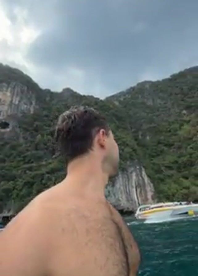 shirtless man on a boat, looking out at a mountainous, green island. Several other people are on the boat, including a woman in a bikini. Other boats are in the water, and the sky is cloudy.