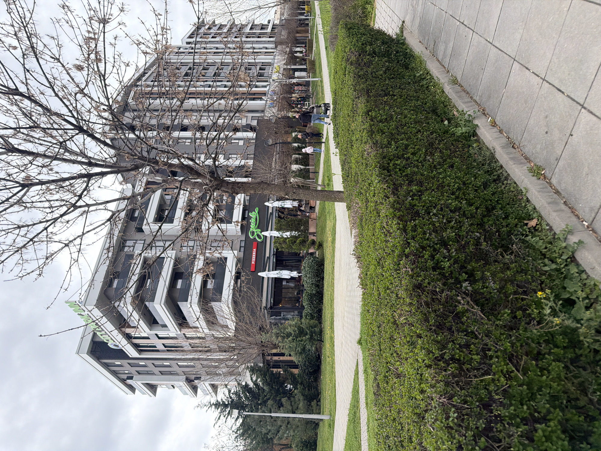 The scene depicts an urban area in Plovdiv, Bulgaria, specifically identifiable by the "CITY PARK INN" signage on the prominent multi-story building. The sky is overcast and grey. In the foreground, a dense, manicured green hedge runs horizontally, bordered by a grey paved sidewalk on its right. Small green weeds and a single yellow flower are visible at the base of the hedge. The midground features a lighter-colored paved pathway winding through a grassy area. To the left, a modern lamppost stands near evergreen trees. Directly behind the grassy area, at the base of the main building, is a two-story commercial structure housing "Pizzeria Speciale," marked by a red "Pizzeria" sign and a green "Speciale" sign. Three white, retracted outdoor umbrellas are positioned outside the pizzeria's large glass windows. Several indistinct figures are visible seated inside the restaurant. Bare deciduous trees with visible seed pods are scattered throughout this section, one centrally located. In the midground, on the paved pathway to the right, an adult male in dark clothing pushes a dark baby stroller away from the viewer. Further down the path, two other individuals, one adult and one child in a light pink jacket, walk towards the left. The background is dominated by the large "CITY PARK INN" building, a modern structure with grey and white facades, multiple balconies with dark railings, and dark-framed windows. Additional commercial storefronts are visible along its base to the right of the pizzeria.