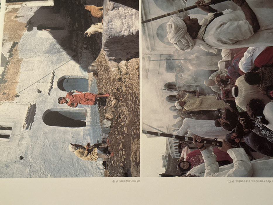 The image displays two distinct photographs, vertically stacked on an off-white page. The upper photograph depicts an outdoor scene in a town or city identified as Chelchaouene (Chefchaouen), dated 1995. The environment features light blue-washed buildings with arched doorways and window openings, casting strong shadows on uneven, rocky, and dirt-covered ground. Two individuals are present: on the left, a person in a light headscarf and patterned tunic is crouched, looking downwards; in the center, a child in a rust-orange jumpsuit runs or steps quickly across the terrain, barefoot or in light shoes. To the right, on a low stone ledge, a black-and-white cat sits upright beside an orange cat. A silver-colored bucket is visible near an arched doorway. The lower photograph captures a crowded outdoor gathering, identified as Essaouira, dated 1997. Numerous people are assembled, including men dressed in traditional white or light-colored robes and turbans, and women with headscarves. Several men are holding long, old-style rifles vertically, with some appearing to fire them, creating significant plumes of white smoke that permeate the scene. In the foreground-right, a man in profile, wearing a white turban, holds a rifle. Another man in white holds a rifle aloft on the left. Many individuals are observing or participating, with some seated or crouching on the ground. Buildings with arched porticos or facades are partially visible in the hazy background. The location is not in the city of Paris, France; rather, the embedded text labels indicate locations in Morocco.