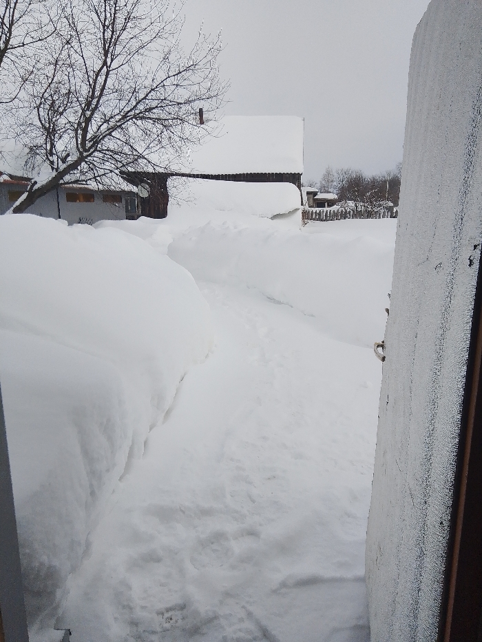 This image depicts a snow-laden winter scene in Kuyeda, Russia, viewed from an opened doorway. The right edge of the frame shows the interior side of a door, featuring a metallic handle and a textured, possibly frosted, surface. A narrow, shoveled path cuts through deep snowdrifts that stand approximately waist-to-chest high on either side. Footprints are discernible along this path. In the mid-ground, to the left of the path, a bare deciduous tree with dark branches extends upwards. Behind the tree, a smaller structure with a light-colored roof and partially visible walls is present. Further back and to the right of this smaller structure, a larger, dark-timbered building (likely a house or barn) features a heavily snow-covered gabled roof with a brick chimney protruding from its peak. A white satellite dish is affixed to the side of this building. The background reveals more snow-covered ground extending towards a rustic wooden fence line. Beyond the fence, a dense line of leafless trees stands against a uniformly overcast, light-gray sky. The entire landscape is blanketed in thick, pristine white snow, indicating significant recent snowfall. No individuals are present in the frame.