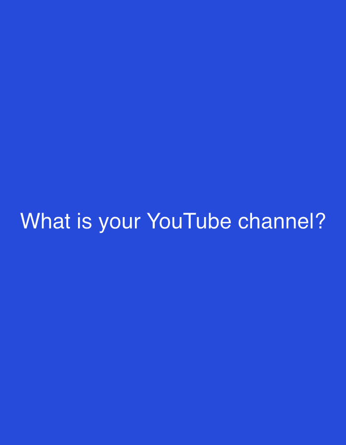 The image displays a uniform, solid blue background. Centered horizontally in the lower-middle portion of the frame is white sans-serif text that reads, "What is your YouTube channel?". No discernible city location, including Bragança, Portugal, is present within the image. There are no people, other subjects, objects (beyond the text and background), actions, or interactions depicted. The environment consists solely of the uniform blue color field, lacking any physical surroundings, natural elements, or architectural details.