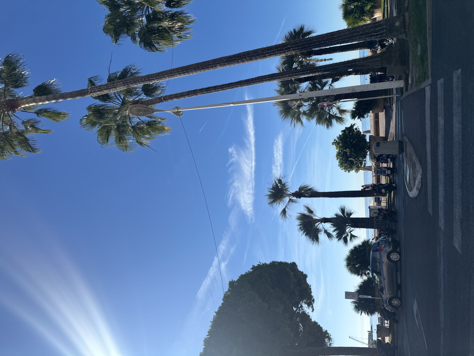 This image depicts a coastal street scene in Cannes, France, likely along La Croisette, on a clear, sunny day. The sky is bright blue, featuring a prominent sun flare emanating from the upper left quadrant, along with several faint white contrails and scattered wispy clouds. In the foreground, an asphalt road with white zebra crosswalk markings is visible. A light grey compact hatchback vehicle is parked parallel to the curb on the street, facing left. A concrete curb separates the road from a paved pedestrian promenade. On this promenade, a minimum of five motorbikes and scooters are parked. A grey cylindrical waste bin is situated near the crosswalk. Tall, slender utility poles and streetlights line the promenade, one of which features a distinctive oval-shaped light fixture. Another pole displays a red and white circular sign. Numerous palm trees are prominent throughout the scene, bordering the promenade and extending towards the background. A large, dark green broadleaf tree is visible on the far left. Beyond the promenade, a low metal railing separates it from a sandy beach strip. The calm, blue Mediterranean Sea extends to the horizon. At least two indistinct human figures are visible on the promenade in the mid-ground, near the parked scooters. Several boat masts are discernible in the far-left section of the water.