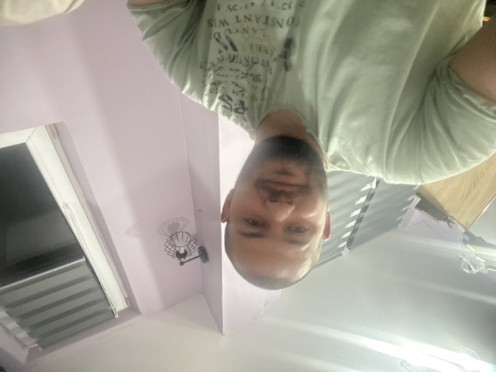 The image displays a male individual, appearing to be in his mid-20s to late-30s, positioned centrally in the frame. He has short dark hair, a dark beard, and a mustache, and is looking directly at the camera with a neutral expression. He is wearing a light green short-sleeved t-shirt with a dark graphic print on the front. The background reveals an indoor room, likely a residential space. The walls are painted a light lavender or purple hue. A white ceiling is visible overhead, illuminated by a partially visible ceiling light fixture in the upper left. A white-framed window, fitted with horizontal striped day-night blinds in alternating light and dark grey patterns, is visible on the right side of the frame. A black metal wall-mounted sconce, featuring a geometric cage-like shade, is affixed to the purple wall to the right of the subject's head, casting faint shadows. A light-colored wooden cabinet or shelving unit is partially visible in the upper left background. The overall illumination suggests artificial light sources are active. Based on the provided context, the location is in the city of Sofia, Bulgaria, though no specific visual identifiers within the image corroborate this geographical detail.