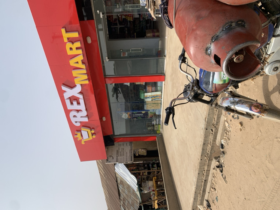 The scene depicts a street view in New Karu, Nigeria, focused on a commercial establishment. A building with a red facade and a prominent sign reading "REX MART" in white and yellow letters, featuring a crowned shopping cart logo, occupies the central and right portion of the image. The building has a full-glass front, revealing shelves stocked with various packaged goods, including bottled beverages. An "OPEN" sign is visible inside the glass entrance door. To the immediate left of REX MART, an older, smaller structure with a corrugated metal roof and walls stands. This structure appears to be another retail outlet, displaying items on shelves and a table outside its entrance. A partially visible white sign with black text, including "ORDER OF SERVICE," is affixed near its entry. In the foreground, an unpaved dirt and sand area with some scattered debris and tire tracks leads up to a raised concrete platform that provides access to REX MART. A concrete curb and a shallow drainage channel delineate the edge of this platform. A dark-colored motorcycle is parked diagonally in the immediate foreground, partially obscuring its frame. It features chrome handlebars and a fender. Attached to the rear of the motorcycle, or resting prominently on it, is a large, reddish-brown, cylindrical metal object, exhibiting signs of heavy welding and wear, consistent with a repurposed industrial gas cylinder. No individuals are distinctly visible in the immediate foreground or clearly identifiable within the visible structures. The sky above is clear and light blue, indicating daylight.