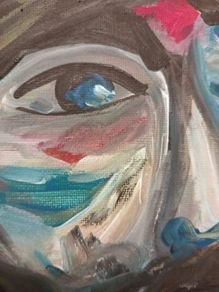 The image displays a digital photograph of a detailed section of an expressive oil or acrylic painting on canvas