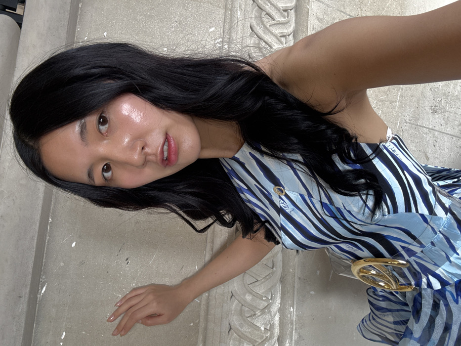A young East Asian woman with long, dark, wavy hair is captured in a close-up, angled portrait, her gaze directed towards the viewer with a slightly parted mouth
