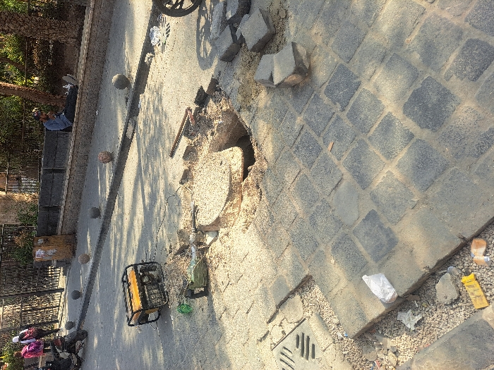 The scene depicts an active street or sidewalk construction zone in an urban area of Unknown, Unknown, under bright daylight