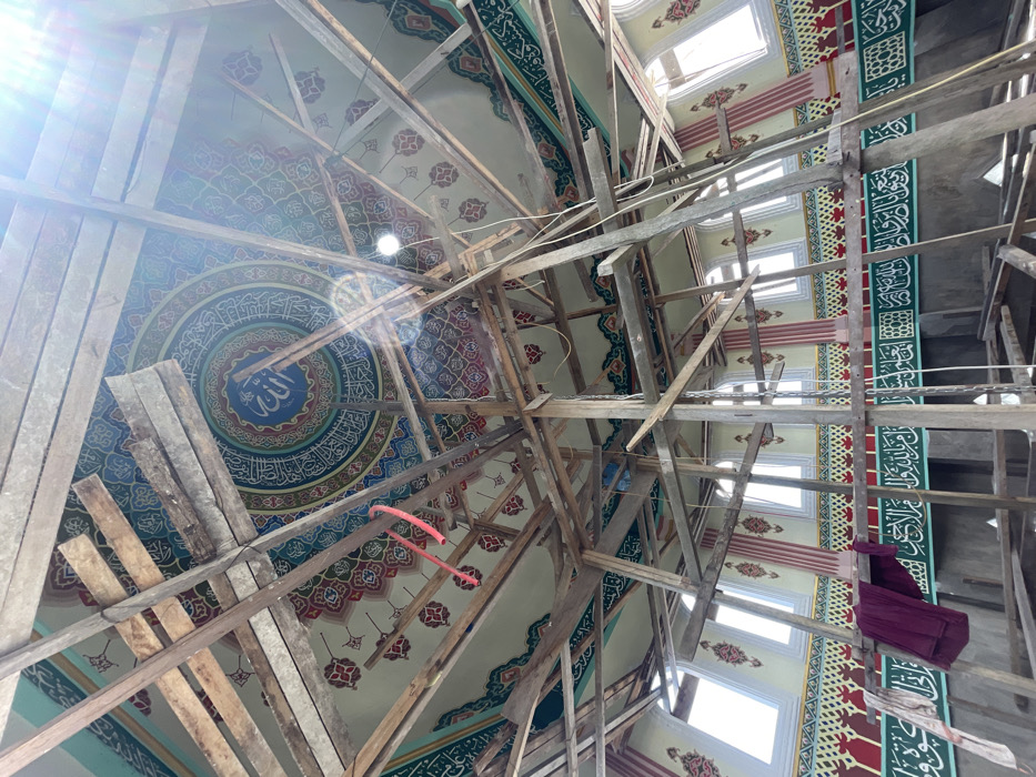 The image depicts the interior of a mosque under construction or renovation in Mns Asan, Indonesia
