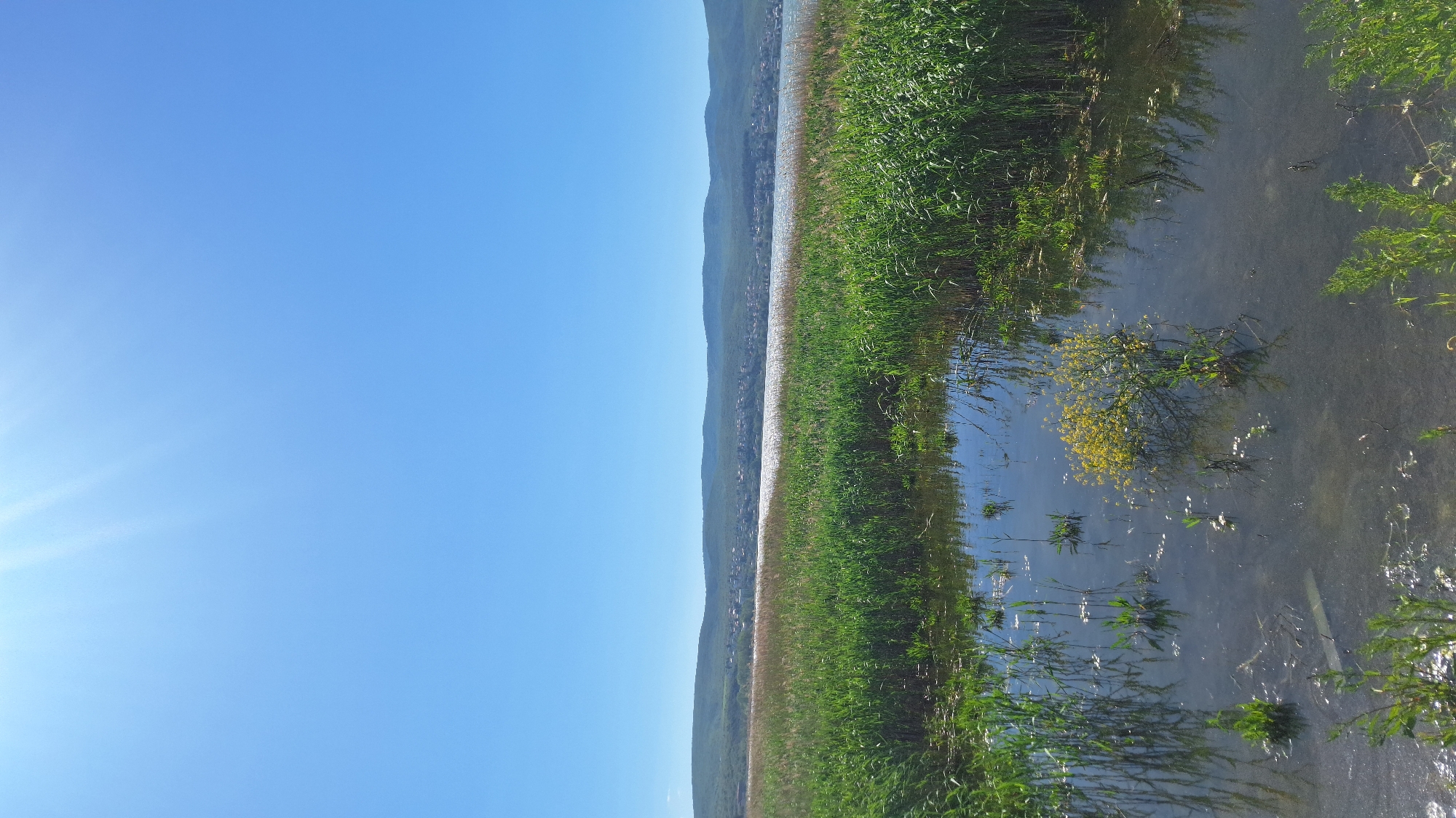 The image depicts a landscape in Doirani, Greece. A clear, blue sky occupies the left portion of the image. To the right, a body of water is partially obscured by tall, green reeds and vegetation. Reflections of the sky and vegetation can be seen in the water. In the distance, a mountainous terrain is visible along the horizon, with what appears to be a settlement nestled along the slopes. The overall scene suggests a wetland or lakeside environment. No people are visible in the image.
