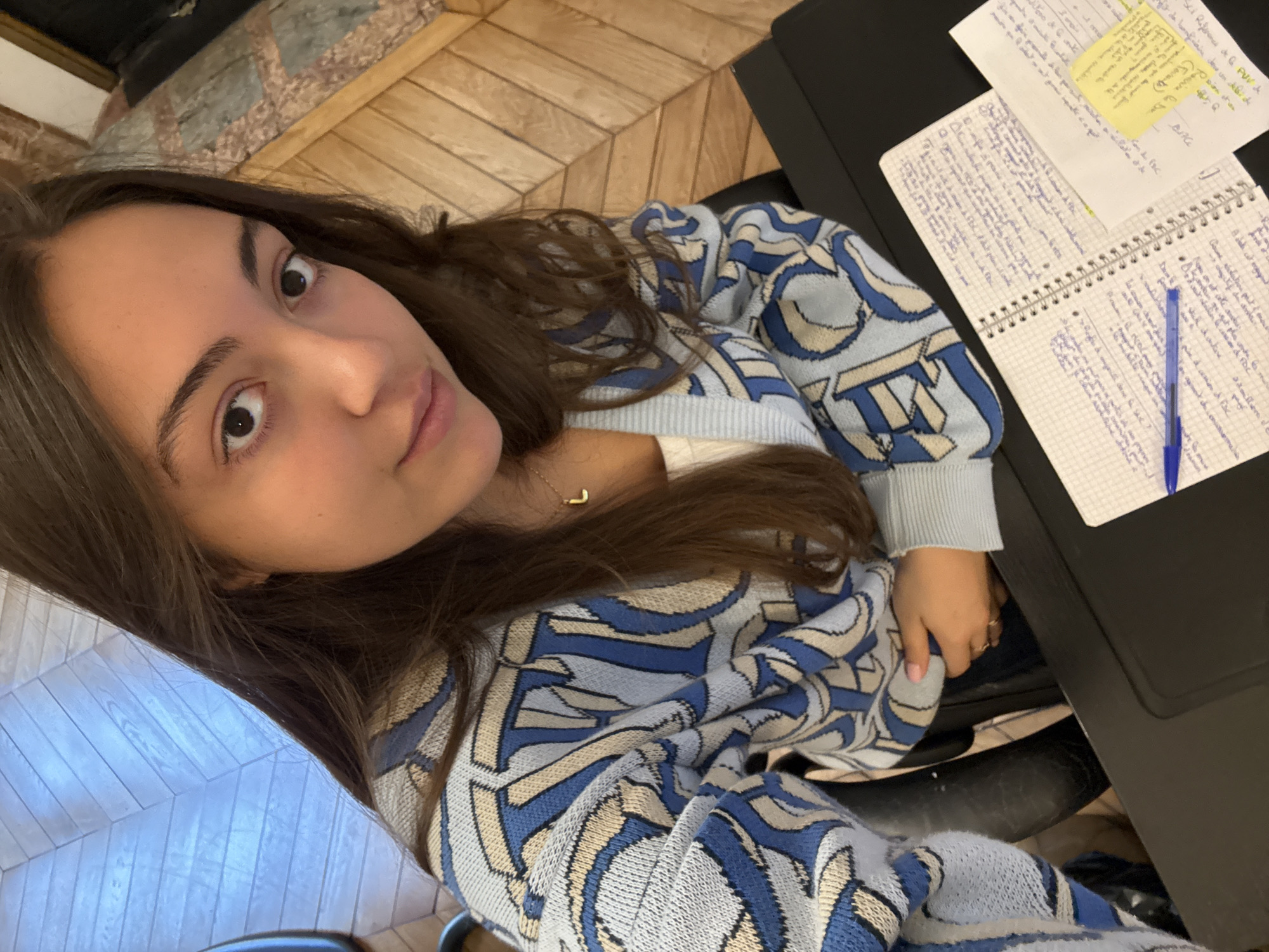 A medium-close-up, high-angle shot depicts a young female seated at a black desk or table within an indoor environment. The subject has long brown hair and brown eyes, directly engaging the camera. She is wearing a light blue, dark blue, and beige patterned cardigan over a white top, with a gold "L" initial pendant necklace visible. Her right hand, featuring light pink fingernail polish and rings, rests near the table's edge. On the black surface in front of her, an open spiral-bound notebook with grid paper is present, densely filled with handwritten notes in blue ink. A blue ballpoint pen rests diagonally across the notebook. To the right of the notebook, a loose sheet of paper and a yellow sticky note, both containing additional handwritten text, are visible. The background elements include light-colored wooden wall paneling arranged in a herringbone pattern, characteristic of Parisian interior design. To the upper right, a portion of a fireplace is visible, featuring a dark rectangular opening and a surrounding facade of multi-toned stone or marble, consistent with typical Haussmannian architecture found in residential and commercial buildings throughout Paris, France. A dark chair back is partially visible in the upper left.