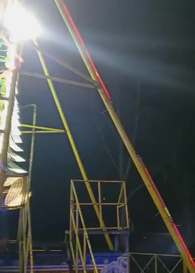 Ferris wheel, brightly lit with colorful lights, turning at night. The wheel is decorated with green, yellow, and blue lights. It is partially obscured by a structure of yellow poles and blue and white panels. A man wearing a hat and dark shirt stands on the left, near the base of the Ferris wheel. The background is dark, with trees visible in the distance. The camera angle is looking up at the Ferris wheel.