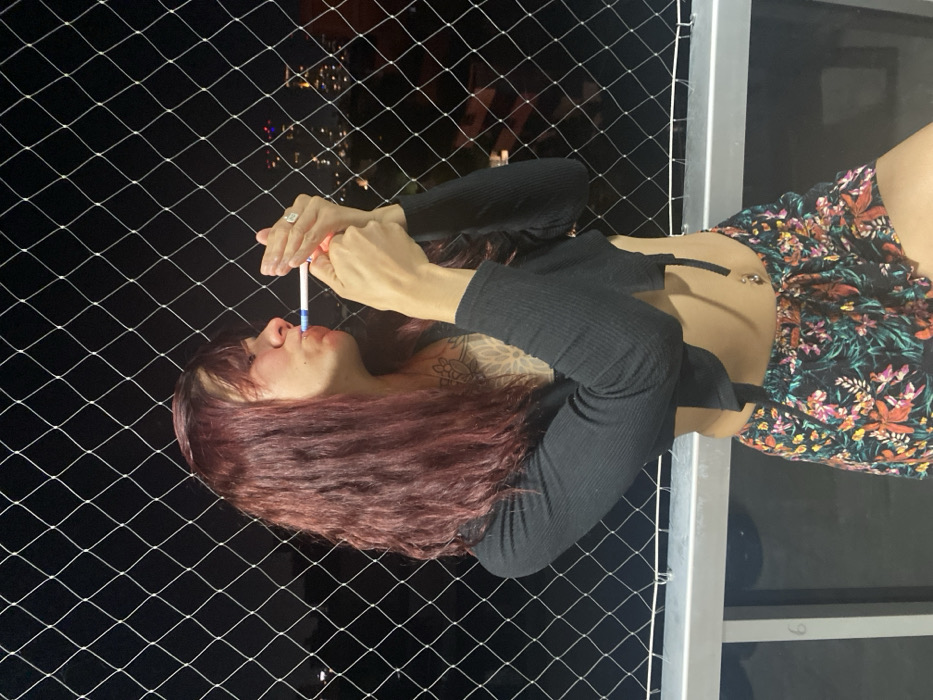 A woman with reddish-brown hair is seen from the side, holding a lit cigarette to her lips. She wears a black, long-sleeved top that reveals part of her abdomen and a high-waisted floral skirt. A navel piercing is visible. A ring adorns her finger. She stands near a safety net, with a nighttime cityscape faintly visible in the background. A metallic frame borders part of the view.