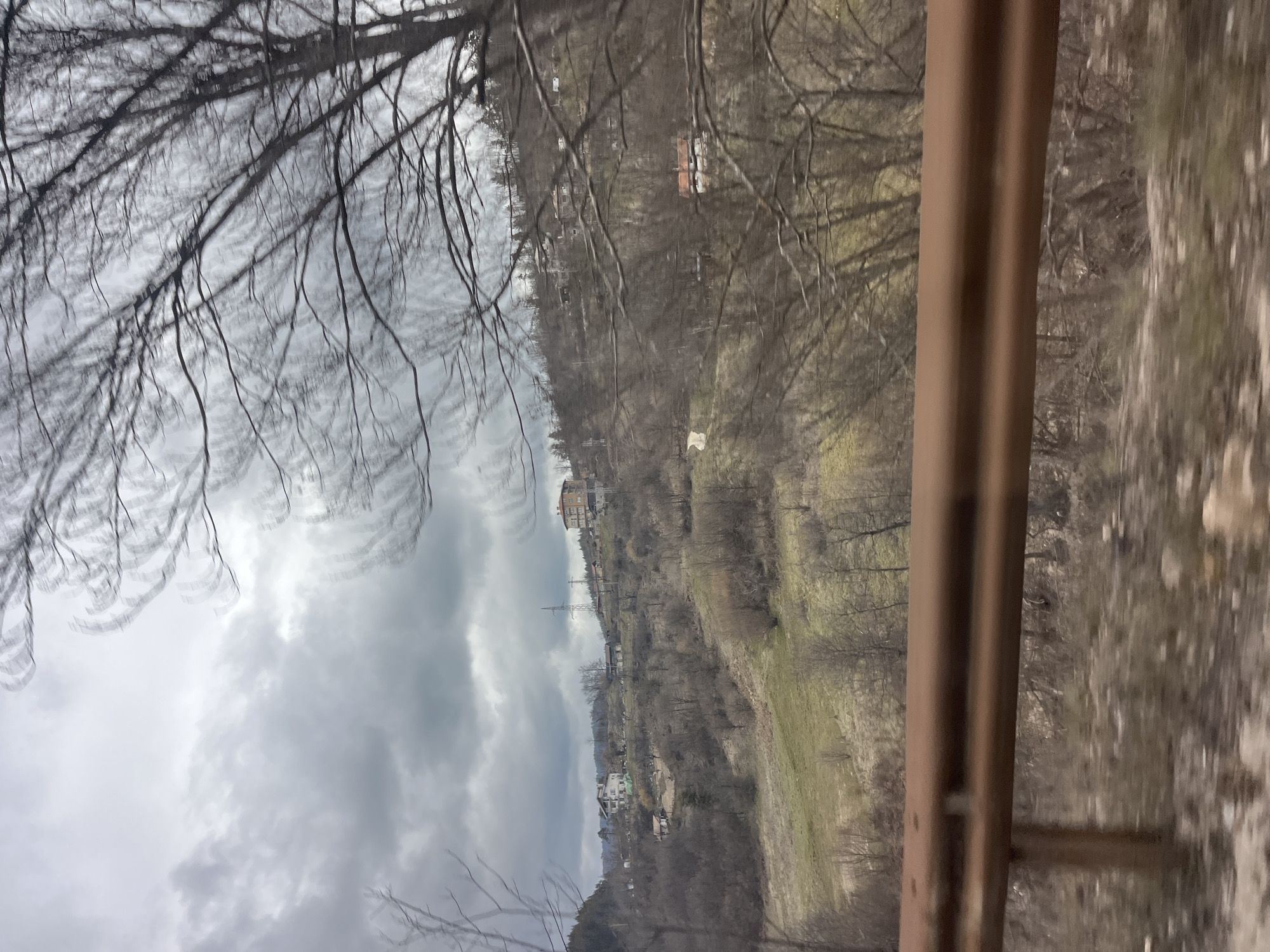 The image depicts a hilly, semi-rural landscape located in or near Lovtsi, Bulgaria, captured from a moving vehicle. A rust-colored, double-bar metal guardrail runs horizontally across the lower third of the frame. Below the guardrail, the ground appears blurred with sparse, dry vegetation. The midground and background consist of multiple undulating hillsides. These hills are predominantly covered with leafless deciduous trees, suggesting late winter or early spring. Patches of dry, light-green or brown grass are visible on the slopes. Several residential buildings are scattered throughout the landscape. On the left hillside, a distinct multi-story white building with a red roof is visible. Higher on a central-right hill, a large metal lattice-work electricity transmission tower stands prominently. To its right, a multi-story residential building with a light-colored facade and a dark roof is situated on a ridge. Smaller, single-family homes are interspersed among the trees on various slopes. A winding, light-colored dirt path traverses a grassy slope in the mid-distance. The sky is entirely overcast with dense, dark gray clouds. Bare tree branches in the extreme right foreground and the immediate ground below the guardrail exhibit significant motion blur, characteristic of a photograph taken from a vehicle in motion. No individuals are visible.