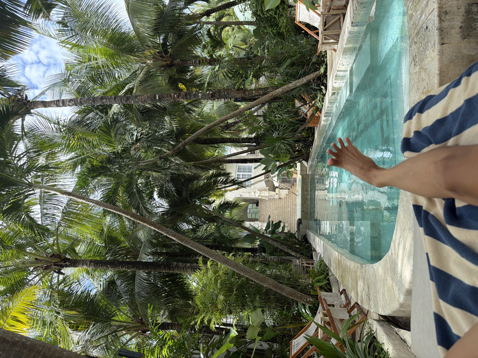 A tropical scene features a swimming pool alongside lush palm trees. A person lounges nearby, draped in a blue and white striped towel, with one foot extended towards the pool. Sunlight filters through the palm fronds, creating a dappled effect. In the background, a white building can be seen through the trees. Chairs are placed strategically around the pool area.