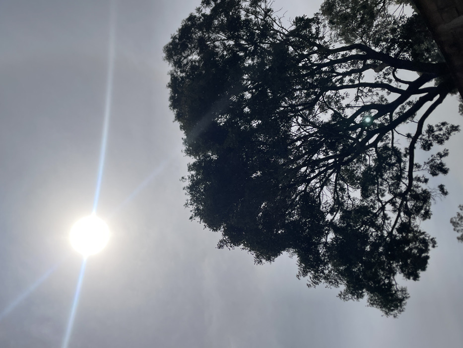 The image displays an outdoor scene in Naraguta Hausawa, Nigeria, primarily featuring a large tree and the sky. A bright, circular sun, emitting prominent horizontal and vertical lens flares, is positioned in the upper left quadrant of a light grey, hazy sky. The tree, heavily foliated and appearing as a dark silhouette due to backlighting, occupies the lower and central-right sections of the frame, showcasing its dense canopy and branching structure against the overcast backdrop. A segment of a light-colored wall or structure is partially visible at the bottom right, beneath the tree. No individuals or discernible actions are depicted.