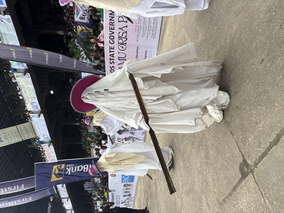 The image depicts an outdoor cultural event in Lagos, Nigeria, likely the Adamu Orisa Play (Eyo Festival), held in a stadium or arena, possibly Tafawa Balewa Square