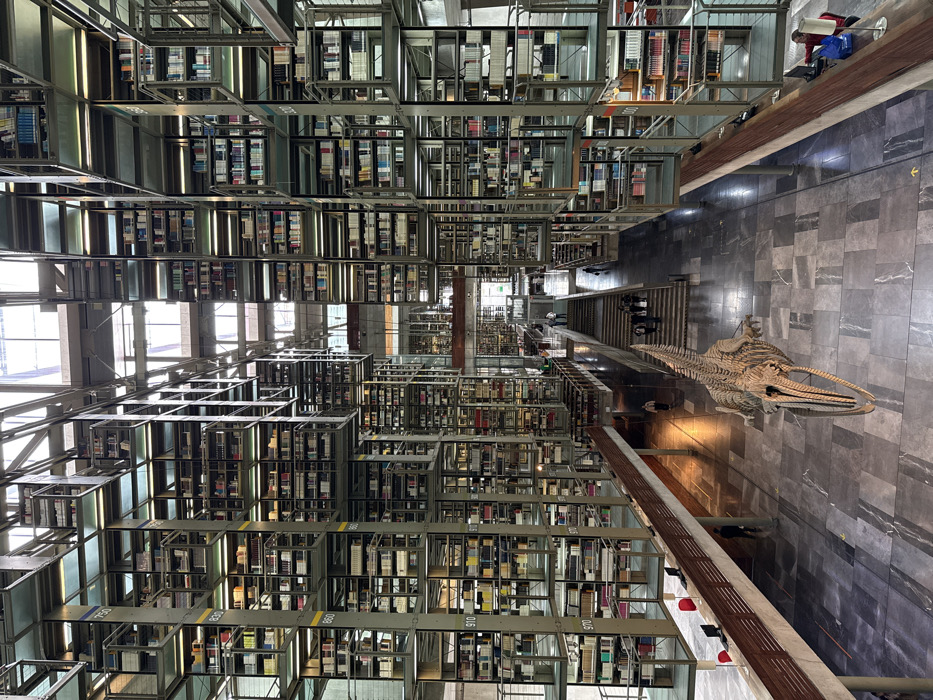 interior of a library with tall shelves filled with books in metal grid structures, arranged in a seemingly floating fashion. A skeleton of a large marine animal, possibly a whale, is displayed on the gray-tiled floor. Sunlight enters through large windows, casting shadows on the floor and illuminating the shelves. People can be seen walking in the background near stairs.
