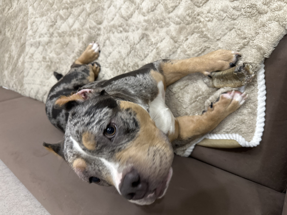 - "A blue merle puppy lies on a brown couch" by FM-3Fotg1, licensed under CC BY 4.0