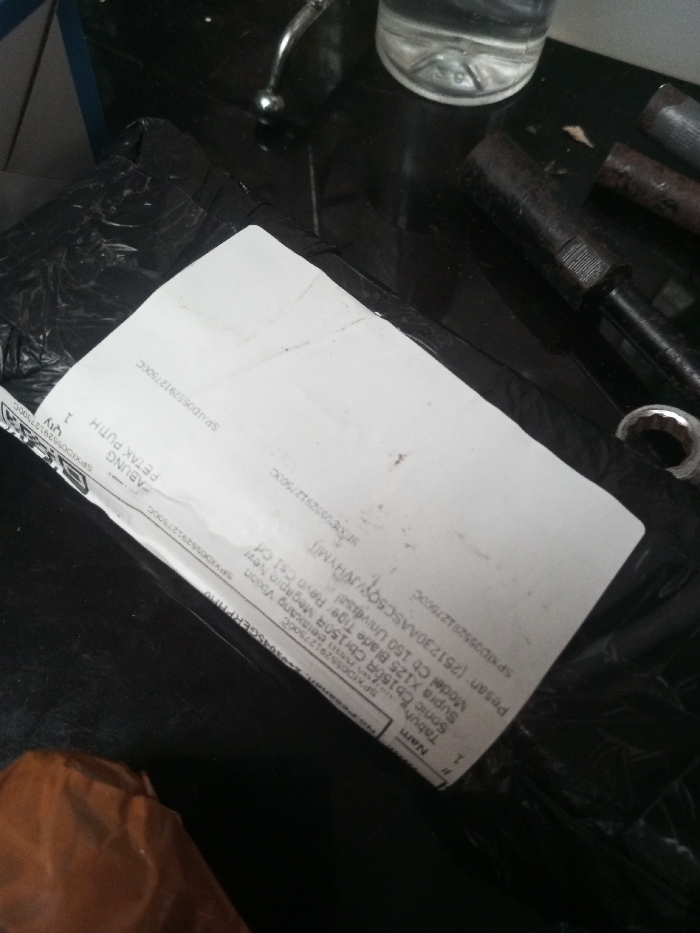 A black plastic-wrapped package, featuring a prominent white shipping label, rests on a dark, reflective surface. The label displays shipping information including multiple alphanumeric tracking codes (e.g., "SPXID06529127500C"), the item quantity "Qty 1", and the Indonesian text "TABUNG PETAK PUTIH" (white square tube/canister). Further details on the label list motorcycle parts compatible with models such as "Supra X 125 Blade tipe universal", "Model CB 150R CB150R", "Megapro New Vision", and "Revo CSL Cfi". To the upper right of the package, a clear glass bottle containing liquid is visible. Directly right of the package, several dark, worn metallic tools, including what appears to be a socket or extension bar, are scattered. A silver wrench head is partially visible at the bottom right. A crumpled piece of brown material is situated in the lower-left corner. A silver, reflective, curved object is present in the upper-left. The environment is indoors, characterized by subdued lighting, and the scene is static with no individuals or active interactions depicted. The scene is located in Ciherang, Indonesia.
