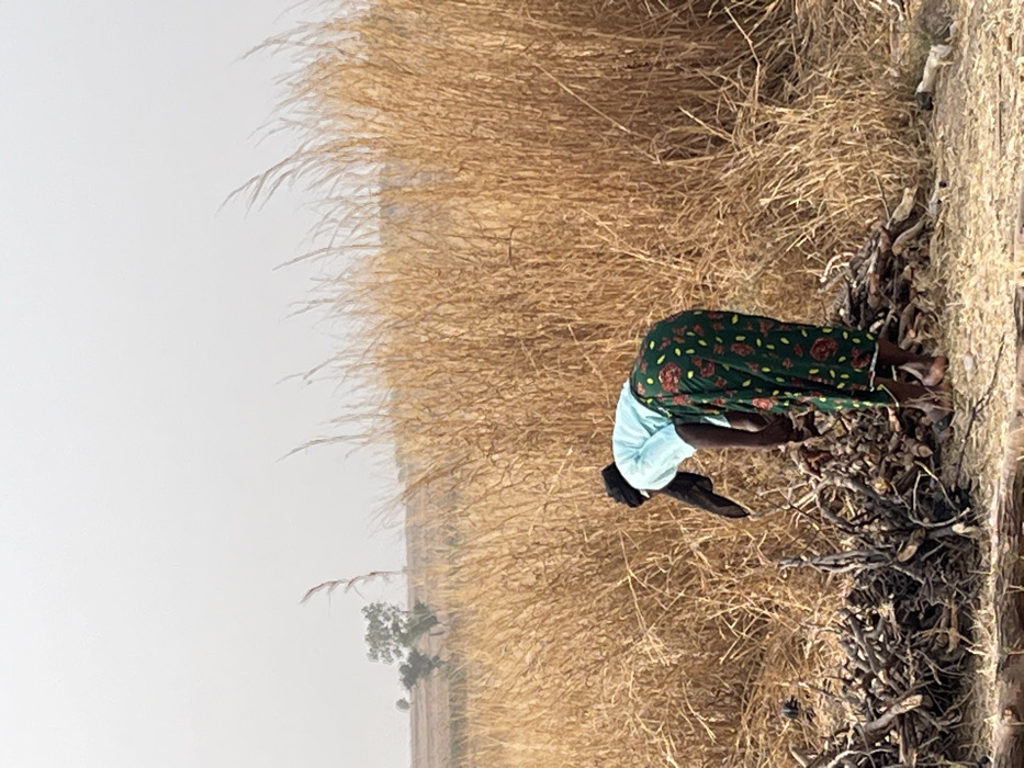 A woman wearing a light blue shirt and green patterned skirt is bent over, collecting firewood in a dry, grassy field