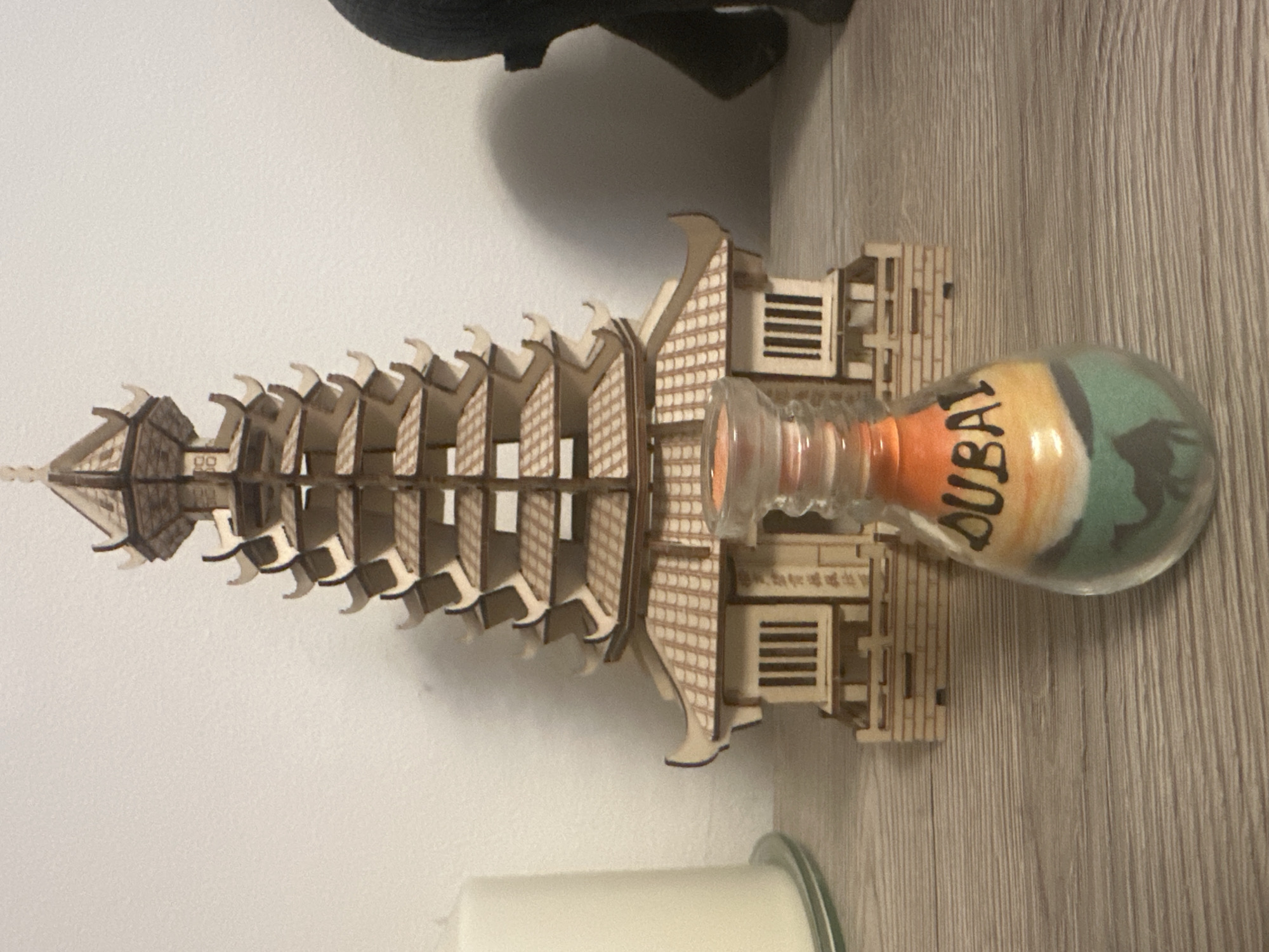 partially constructed wooden model of the Burj Khalifa, an iconic skyscraper located in Dubai, United Arab Emirates, laying horizontally on a surface resembling a wooden tabletop. At the base of the structure is a glass bottle filled with colored sand, with the word "DUBAI" printed on its side. There is also a white object visible at the bottom of the frame. The image was not taken in Munich, Germany.