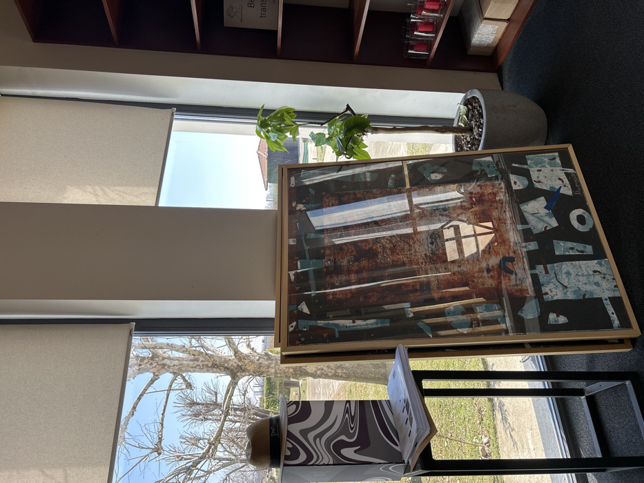 The scene depicts an indoor area, likely a gallery or display space, situated in Iganovo, Bulgaria. The vantage point is from inside, looking towards a series of large windows that reveal an exterior environment under a clear blue sky. Light-colored roller blinds are partially lowered over the upper sections of the windows. In the foreground, slightly right of center, a large, rectangular framed artwork leans against a wall. The artwork features an abstract composition with a dominant rusty brown and dark blue palette, exhibiting distressed textures and geometric forms in its lower section. A lighter wooden frame encloses the piece, and reflections from the windows are visible on its surface. Another framed piece is partially visible behind it. To the left, a black metal stand with a square top supports a stack of white papers or booklets. On top of these papers rests a box with a swirling pattern of grey, purple, and white. A light-brown straw fedora-style hat with a dark band is placed atop this patterned box. To the right of the central artwork, a small, vibrant green plant with several leaves and a slender trunk is contained within a grey concrete-like pot, positioned directly in front of a window. Further to the right, a dark wooden shelving unit occupies the wall space. The second shelf from the top displays a white sign with black text, partially visible, featuring a small circular graphic and the words "Be trans..." The third shelf from the top holds a row of multiple small red candles in clear glass holders. The bottom shelf contains several light-brown cardboard boxes. The floor is covered with dark, possibly black, carpeting. Through the windows, an outdoor landscape is visible, featuring several deciduous trees with bare branches, green grass, and in the distance, a building with a red tiled roof under the bright sky. No individuals are present or engaged in any discernible action within the frame.