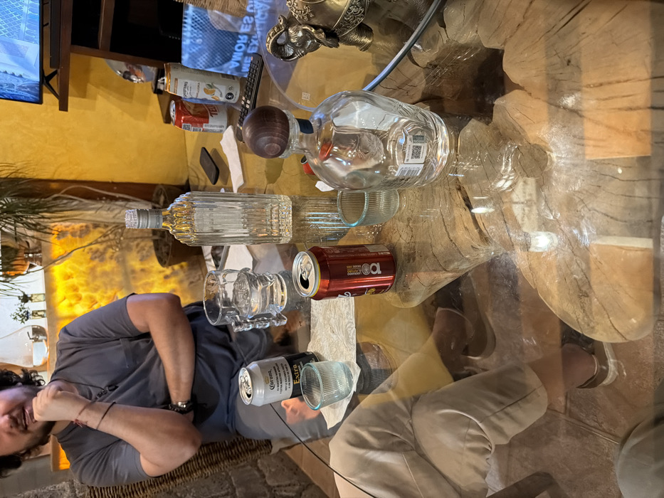 The image depicts an interior scene, likely a private residence or a local establishment in Cuernavaca, Mexico. A male individual with dark, curly hair and a beard, wearing a grey t-shirt, is seated on the left, facing right. His right hand is near his chin, and his left arm is crossed, with a watch on his wrist. He appears to be speaking or listening. The lower legs of a second individual, wearing light-colored trousers and brown shoes, are visible under the table on the left. The central focus is a clear glass-top table supported by a base of natural, irregularly shaped wooden slabs. Arranged on the table are various beverage containers: a tall, clear ridged glass bottle (mostly full), a clear glass carafe with water and a skull design, an opened red Coca-Cola can, an opened Corona Extra beer can, and an empty, clear glass tequila bottle with a wooden stopper. Two small, clear fluted shot glasses are also present. Additionally, a crumpled white napkin, a black smartphone, and a black remote control are on the table. In the background, on the right side, two more unopened beverage cans (one red Coca-Cola, one silver/white with orange text, possibly Topo Chico Hard Seltzer) are visible near a dark wooden shelf unit holding a television screen. A metallic elephant figurine sits on the table's right edge. The immediate environment features a textured stone wall on the left and a vibrant yellow-orange wall on the right. A back-lit panel, possibly onyx, with small potted plants on top, is visible on the rear wall, along with a larger potted plant. The television screen displays fragmented white text against a blue background, with reflections of the room visible. The floor beneath the table appears to be tiled.
