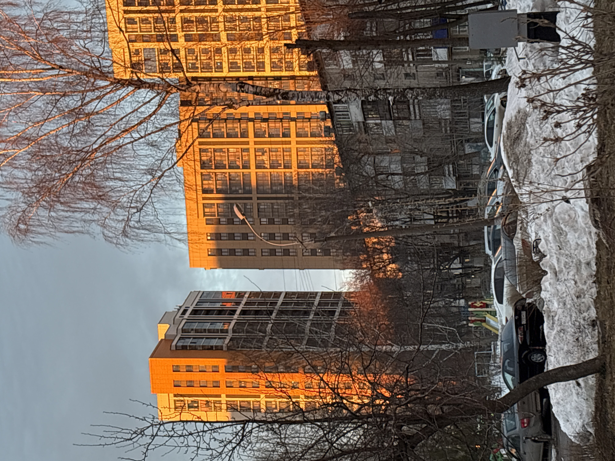 A forensic description of an urban residential area in Perm, Russia, captured during either sunrise or sunset, depicting a scene in late winter or early spring