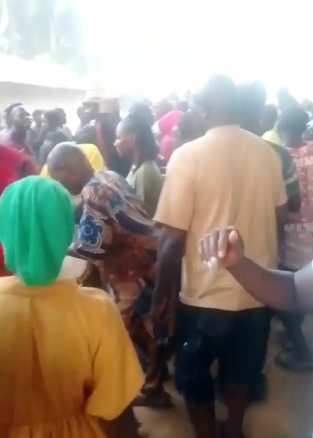 A crowd of people appears to be dancing and celebrating outdoors. People are wearing various colorful clothes, and there is music playing, possibly from a drum being played in the center. The scene seems lively and joyful.