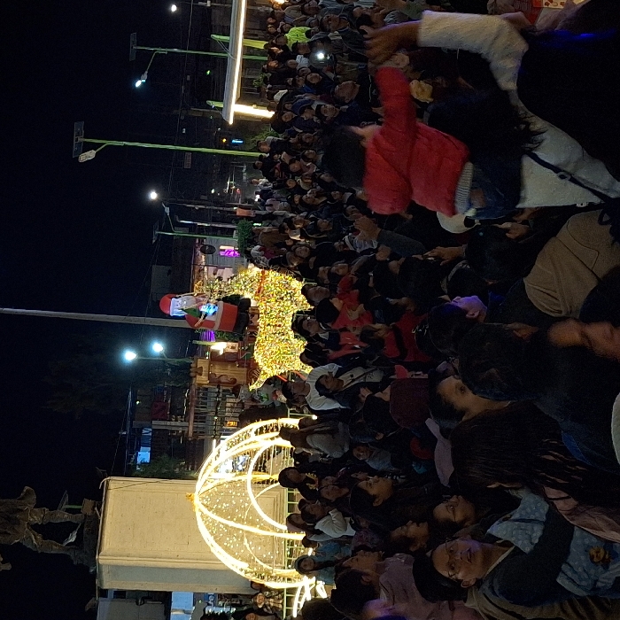 A large crowd gathers at night, their faces tilted upward towards festive lights. A Santa Claus figure rides atop a decorated Christmas tree, the scene bathed in the warm glow of holiday lights. A spherical light structure stands in the foreground. Streetlights line the street. People of all ages are visible, captivated by the scene.