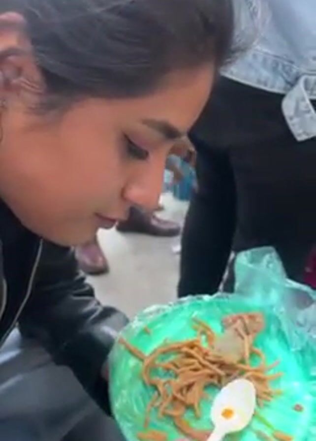 young woman with dark hair eating noodles with a plastic spoon from a green plastic plate. She has makeup on her eyes. The background includes other people, some with shopping bags, and a glimpse of a brown shoe. The scene seems to be outdoors.